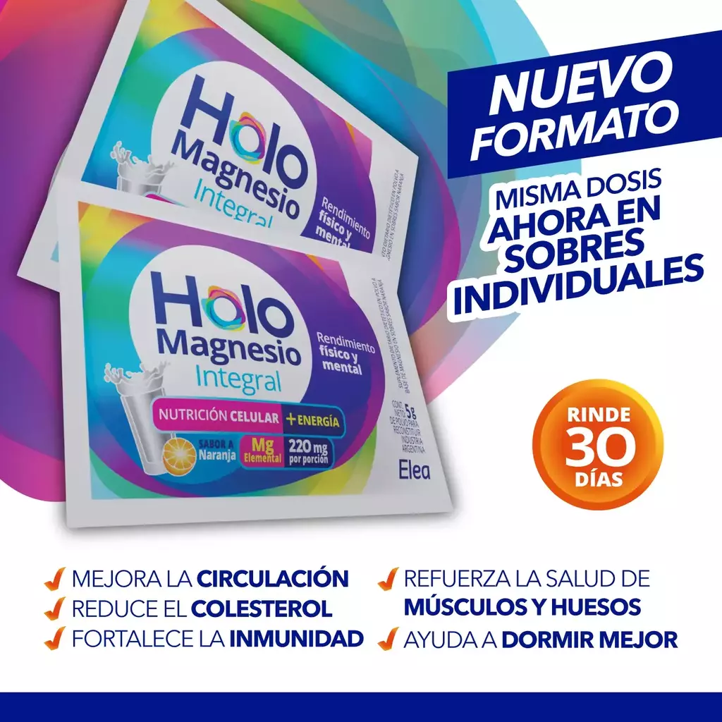Holomagnesio Integral es un suplemento dietario con Trimagnesio de Óptima Absorción que colabora con múltiples funciones del cuerpo: fortalece la salud de huesos y músculos, mejora el descanso, regula la circulación, equilibra los niveles de colesterol, fortalece la inmunidad, entre otros. Concentra gran cantidad por dosis: 220 mg de citrato de magnesio por porción.